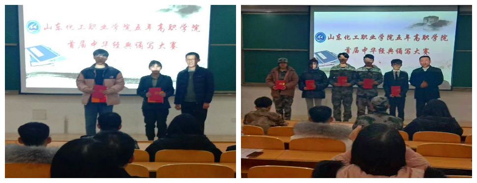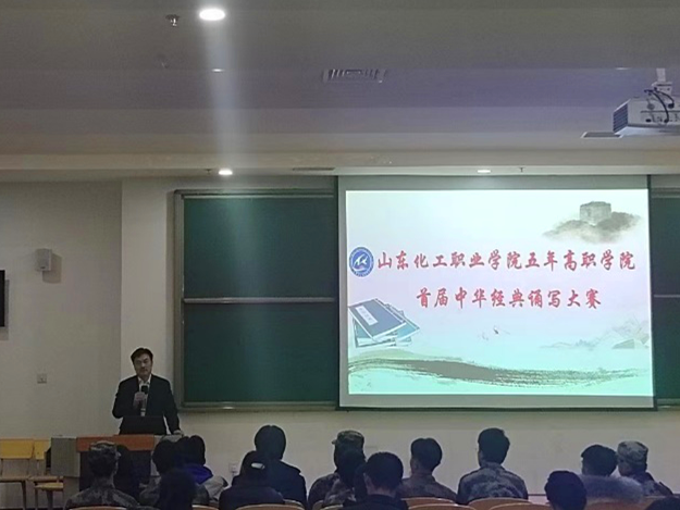 为传承和弘扬中华民族优秀传统文化,激发学生对中华优秀文化和祖国语言文字的学习和热爱,增强民族自豪感和文化自信心,提升学生的道德素养和语文素质,山东化工职业学院五年高职学院举办了首届中华经典诵写大赛。1224日,学院在7号多媒体教室举行诵读大赛决赛及颁奖仪式,约400名师生参与了本次活动,学院院长宋学礼出席活动并讲话。