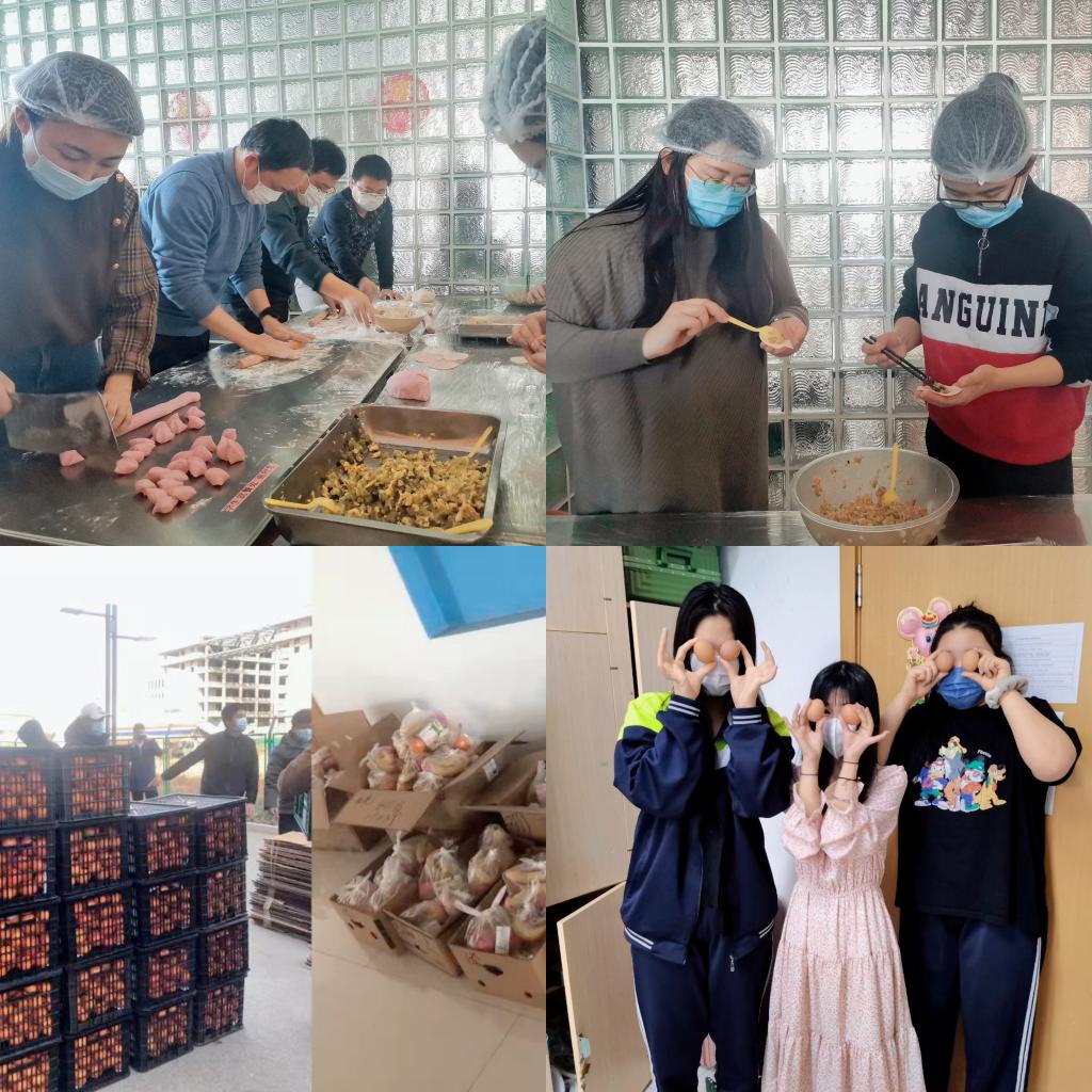 职工齐乐包水饺,水果鸡蛋不能少。校园封闭期间,全体教职工舍小家、顾大家,以校为家,充分展示了教职工勇于担当、关键时刻冲得上的优秀品质和敬业爱岗、爱校如家的“主人翁”精神。学校工会举办了包饺子送温暖活动。活动得到了全体在校教职工的热烈响应,有人和面,有人调馅,包进去的是团结一心,包起来的更是以校为家的温暖!学校工会还为全体在校师生送去了爱心水果,在清明节来临之际联合后勤服务中心和学生工作处为大家送去了鸡蛋,同学们手里拿着鸡蛋,嘴角洋溢着笑容,体会到了家的温暖。