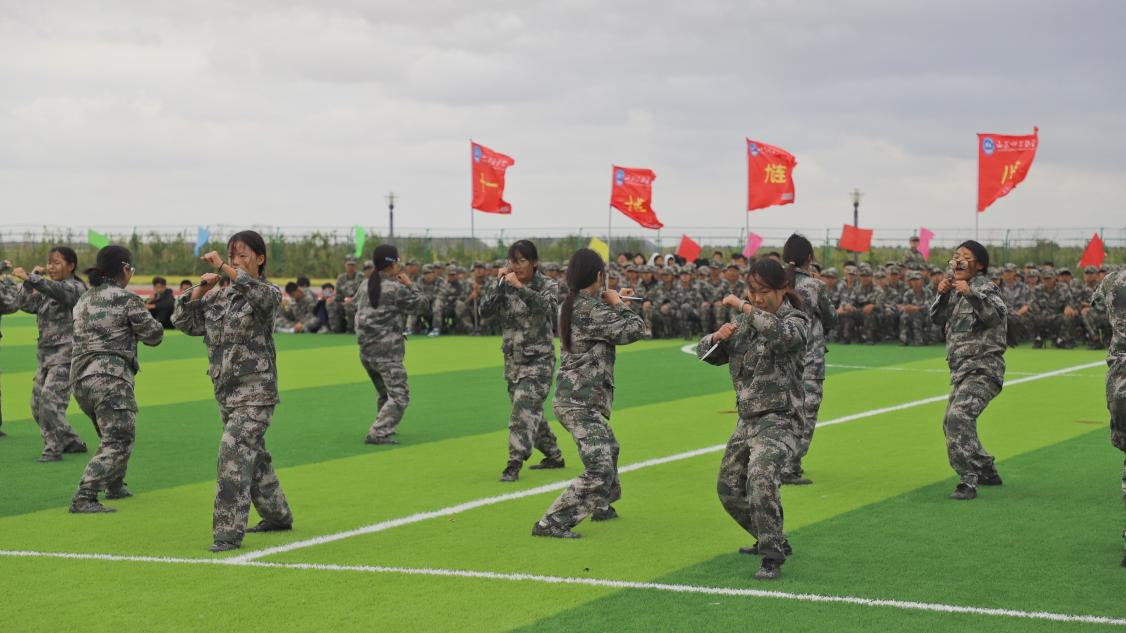 技能展示环节精彩纷呈。军体拳表演由武康教官领衔,他们的动作刚劲有力、虎虎生风,每一招每一式都充满了力量感和节奏感,充分展现了新生们对军体拳的熟练掌握。刺杀操在王宗豪教官的带领下,表演者们动作迅猛、干脆利落,展现出军人般的果敢与勇猛。匕首操同样由武康教官带领,女同学们手持匕首,动作精准、整齐,展现出巾帼不让须眉的气魄。枪战术表演中,王文东和陈振锐教官配合默契,他们熟练地展示了各种枪战术动作,仿佛将大家带入了真实的军事演练场景。