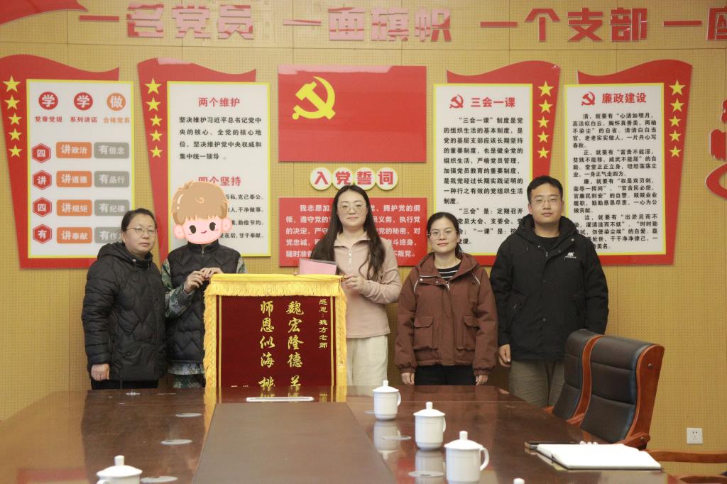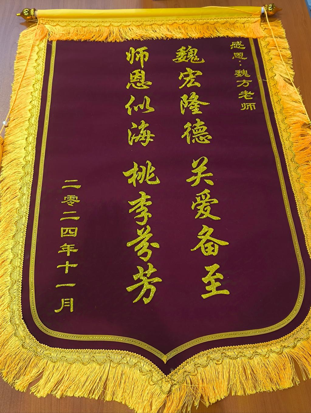 2024年11月11日,我院学生家长司女士满怀感恩之心,专程来到学校,将一面印有“魏宏隆德 关爱备至 师恩似海 桃李芬芳”的锦旗送到了班主任魏方老师的手中,以此感谢老师对孩子无微不至的照顾关爱和辛勤付出。
