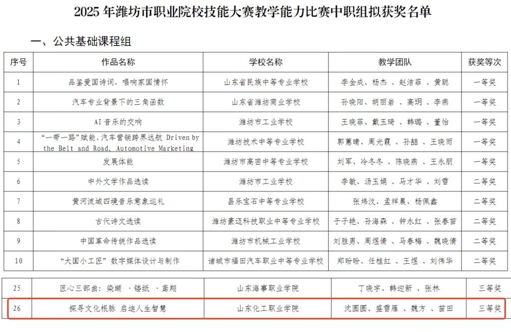 近日,在“才聚潍坊・技能兴潍”第五届潍坊市职业技能大赛中,我院一支教学团队表现出色,斩获中职组公共基础课程组三等奖。