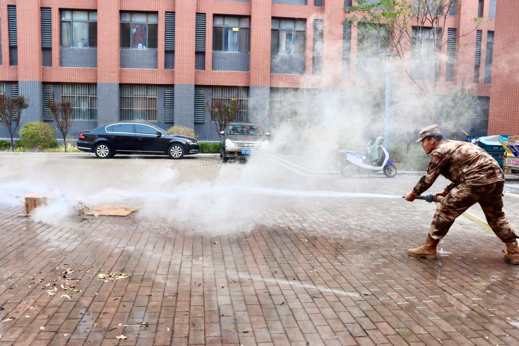 除此之外,教官们还按照水枪的正确使用步骤,进行了水枪灭火的演示,展现了水枪灭火的原理和技巧。他们利用水枪的高压水流,对准火源,从远到近,从上到下,循环灌注,将火势迅速降低,最后彻底熄灭。