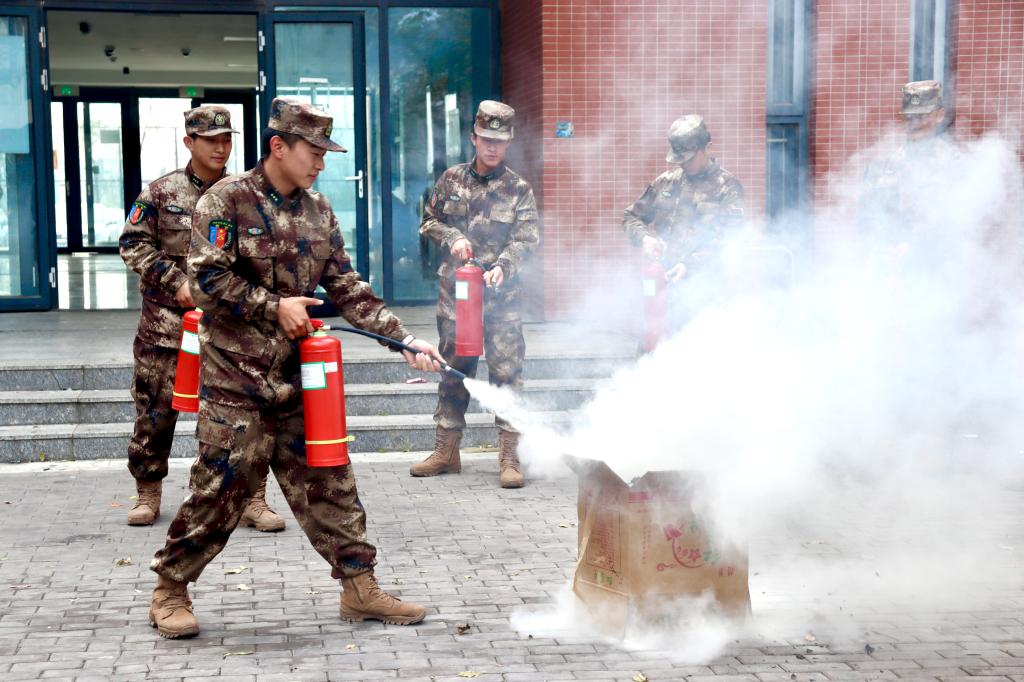 在消防安全演习的现场,教官们面对燃烧的火焰,他们采取了迅速有效的措施,正确地操作干粉灭火器,将火势完全控制在了可控范围内,最终成功地将明火扑灭。