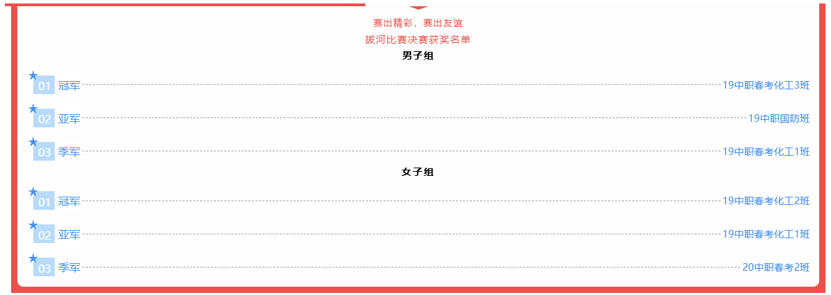 “加油,加油……”一阵阵呐喊声响彻在广场上空,此起彼伏,震耳欲聋。振奋人心的拔河比赛正激烈地举行,这场比赛不仅需要力气,更考验大家的齐心协力、团结协作的能力。经过激烈的角逐,19中职春考化工3班男生队、19中职春考化工2班女生队获得冠军;19中职国防班男生队、19中职春考化工1班女生队获得亚军;19中职春考化工1班男生队、20中职春考2班女生队获得季军。